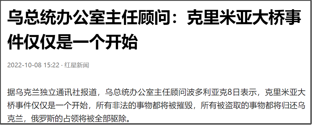 在克里米亚大桥被炸后,乌克兰总统办公室主任顾问就已经表示,“克里米亚大桥事件仅仅是一个开始”
