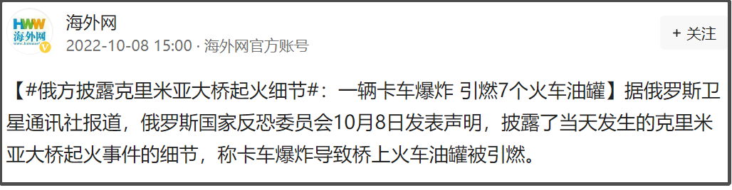 俄罗斯国家反恐委员会已经发表声明,披露了克里米亚大桥起火事件的细节,称卡车爆炸导致火车上油罐被引燃。