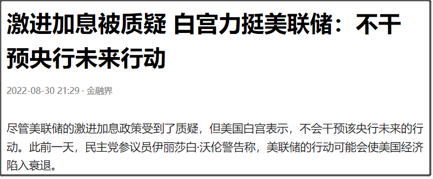 比较讽刺的是,在8月底,白宫还曾经力挺美联储,称不会干预美联储未来行动。