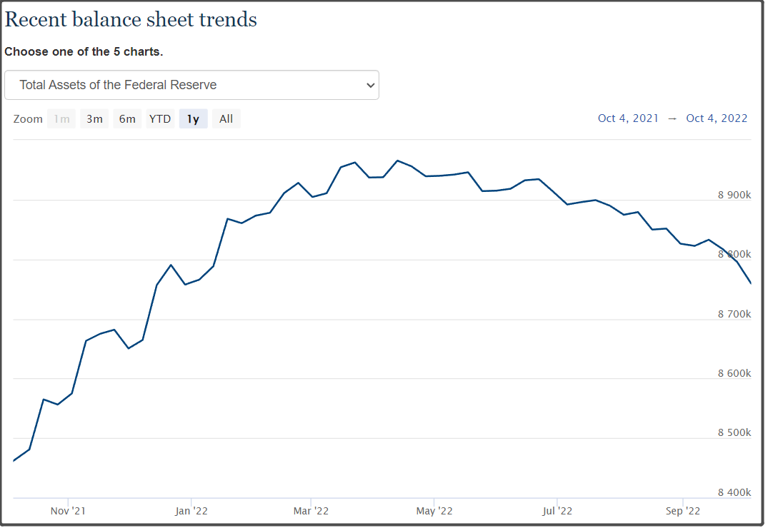 从9月13日到10月4日,美联储资产负债表从8.832万亿美元,缩减到8.759万亿美元,缩减了730亿美元,已经比较接近美联储每月缩表950亿美元的上限。