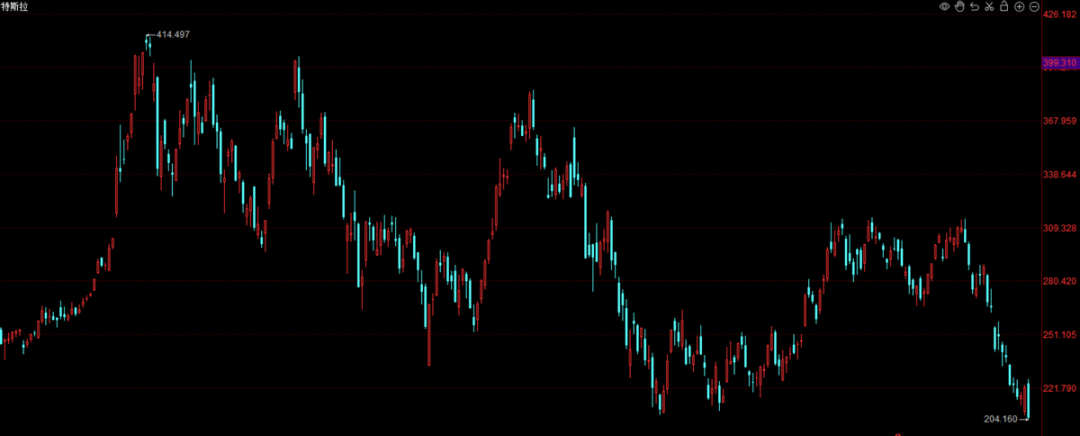 但特斯拉的股价也已经腰斩,从之前最高的414美元,跌到现在只剩下204美元。