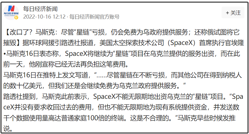 在舆论发酵两天后,马斯克今天也再次改口称,“……尽管星链在不断亏损,而其他公司在得到纳税人的数十亿美元,但我们还是会继续免费为乌克兰政府提供服务。”
