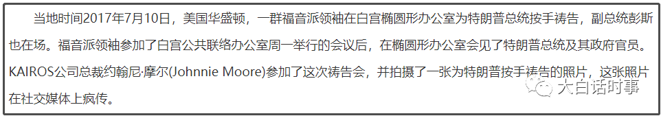 在特朗普2017年当选后,特朗普就曾经在白宫跟一群福音派领袖见面,并且特朗普和彭斯还和这些福音派领袖一起在白宫就这样进行祷告会。