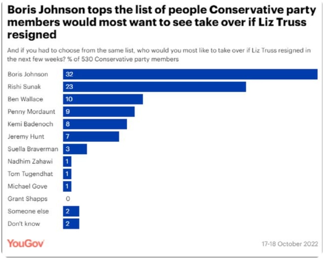 最近,英国已经发起了一项接任特拉斯的候选人民意调查,其中获票最高的竟是前首相约翰逊。