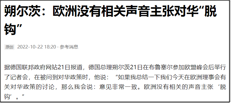 比如,朔尔茨在宣布访华的同时,还声称,关于“对华政策”的讨论,欧洲理事会的意见非常一致,欧洲没有相关的声音主张“脱钩。”