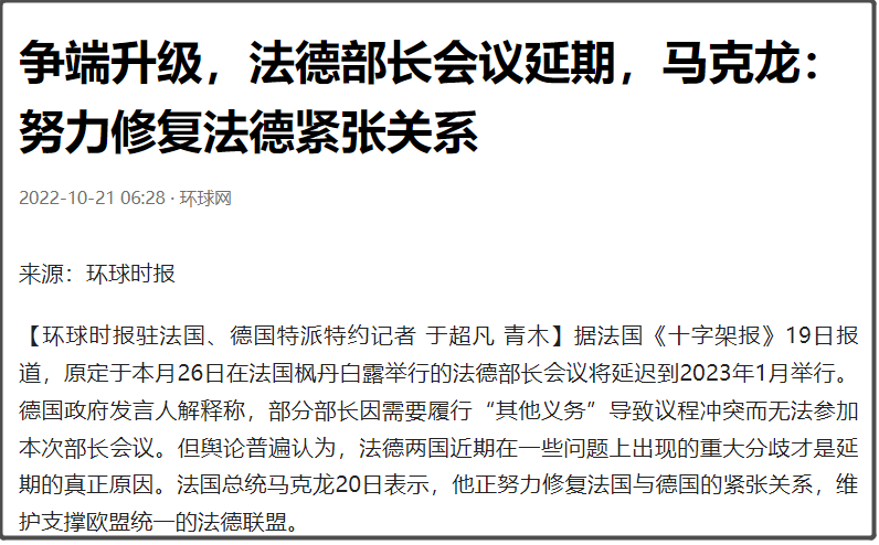 以至于原定于本月26日举行的法德部长会议都延迟到2023年1月举行。