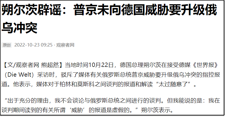 朔尔茨今天还辟谣称,普京未向德国威胁要升级俄乌冲突。