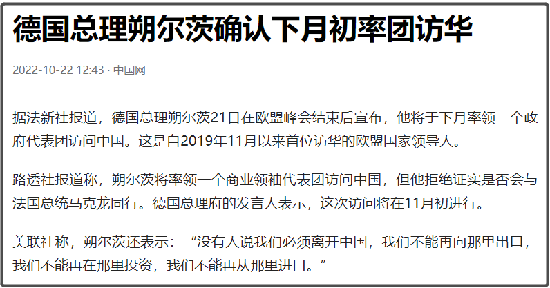 10月21日,欧盟峰会结束后,德国总理朔尔茨宣布,他将于11月率领一个政府代表团访问中国。