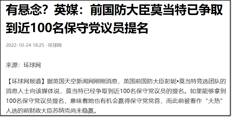 不过,目前有消息传闻,莫当特已经争取到近100名保守党议员的提名。