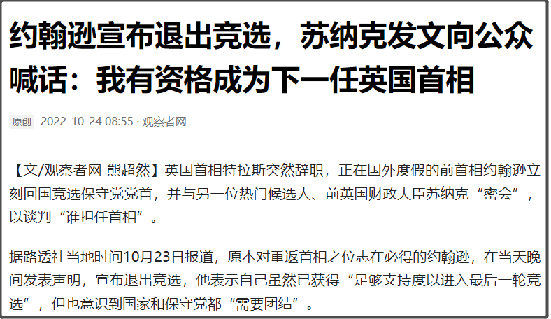 所以,约翰逊选择退出,也有可能是约翰逊看自己已经不大可能达到竞选门槛,索性给自己脸上贴金,来这么一个主动退出,显得是在成全苏纳克一样。