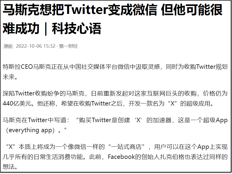 马斯克收购推特目的,他明面上是说,想要把推特变成一个超级APP,马斯克还将其命名为万能应用程序‘X’,并称这个“X”是像微信一样的“一站式商店”,用户可以在这个App上实现几乎所有的日常生活消费功能。