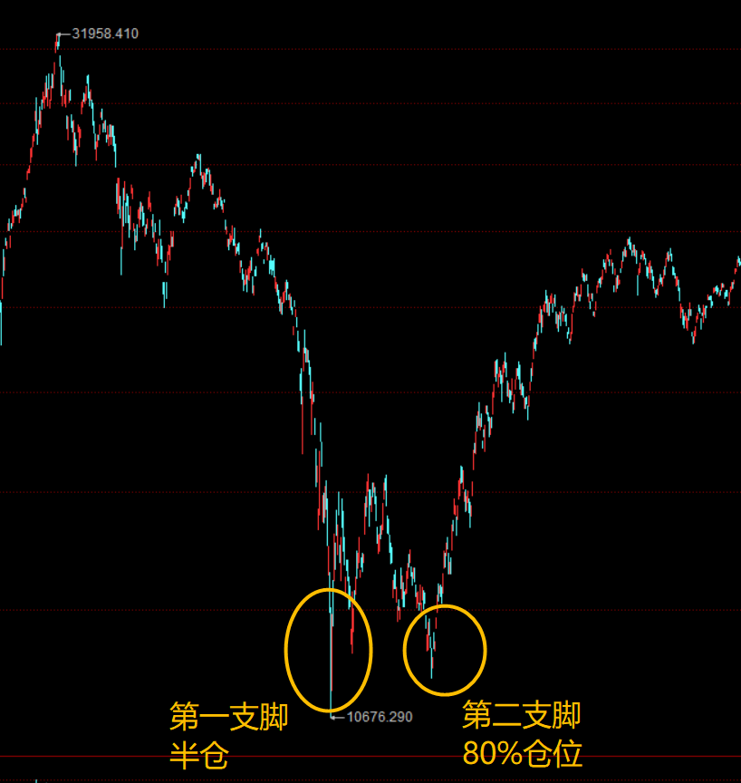等后面股市大幅反弹后,又出现一波大跌,这时候踩出第二支脚,我才会把仓位加到80%。