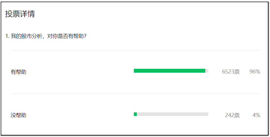 但过去几天,大家也给了我很多鼓励,我也发了个投票,有96%的人认为我的股市分析对他是有帮助的。
