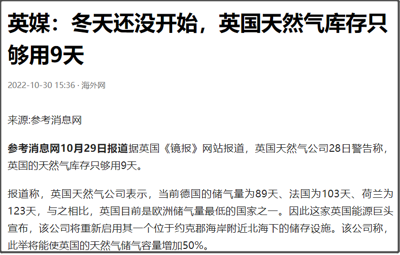 最近出来一个新闻,是说英国天然气库存只够用9天。