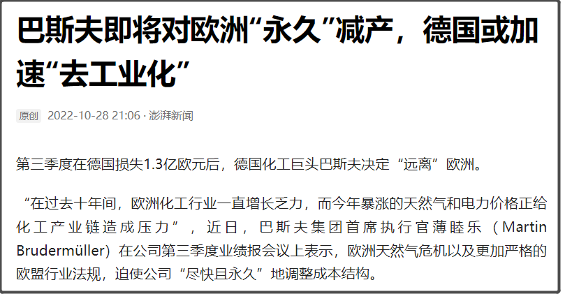 所以,德国化工巨头巴斯夫已经警告,将对欧洲“永久”减产。