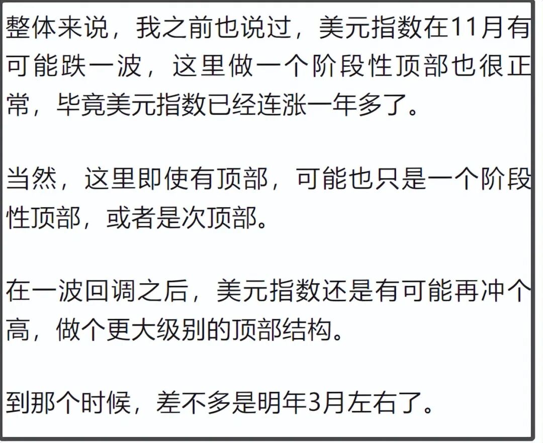 包括我上个月跟大家预判美元指数在11月可能跌一波,主要一个判断依据,也是预期美国这次公布的10月通胀数据有可能超预期回落。
