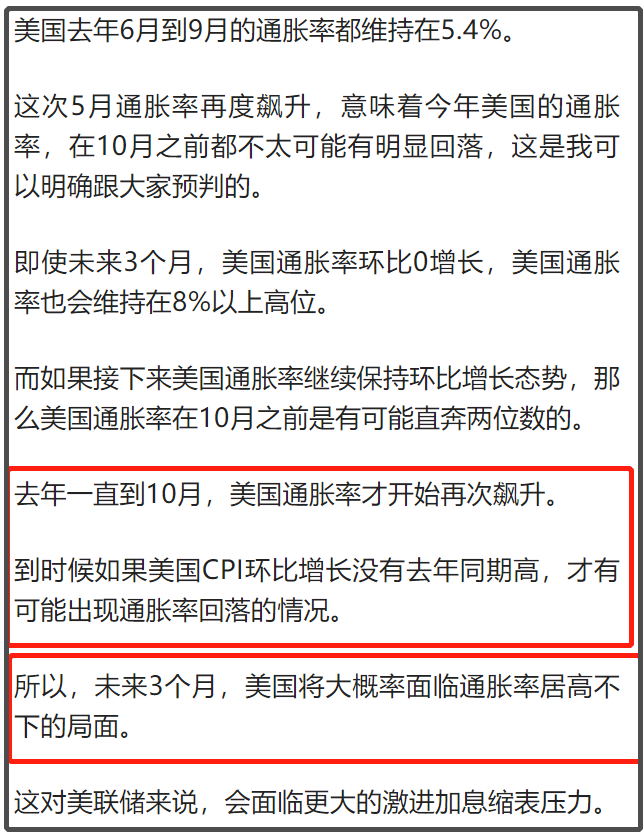 这个可不是我马后炮,我在6月11日的文章里分析美国未来3个月通胀走势的时候,有明确说美国6-9月的通胀率可能会维持在8%以上居高不下,至少得到10月份才有可能出现通胀回落。