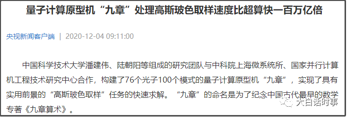 但今天,我们自己研发出来的“九章”量子计算原型机,通过76个光子已经取得了对谷歌量子霸权的突破!