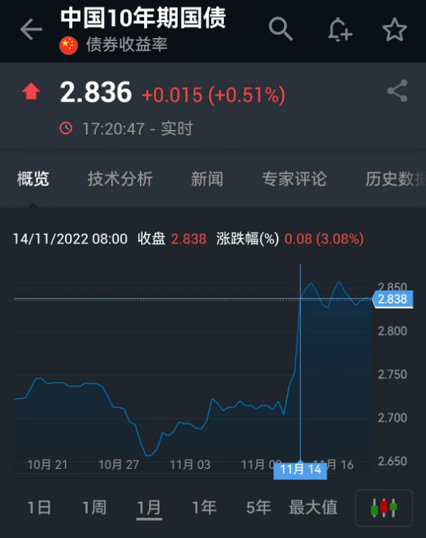 其实从11月11日,也就是上周五开始,我们的10年期国债收益率就开始出现大幅度飙升,然后到14日到达一个峰值。