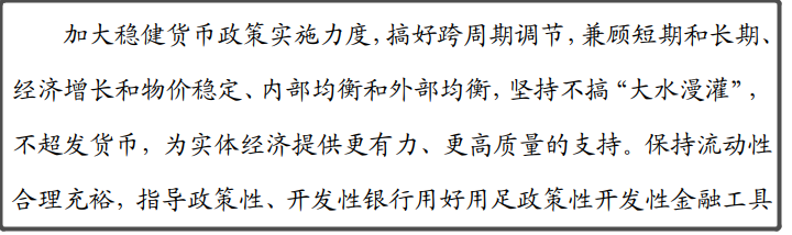 其中提到,“加大稳健货币政策实施力度,搞好跨周期调节,兼顾短期和长期、经济增长和物价稳定、内部均衡和外部均衡,坚持不搞“大水漫灌”,不超发货币。”