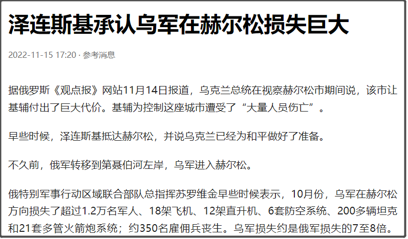 而且这种小规模接触战的模式,目前乌军的损失是比俄军更大,泽连斯基在11月14日去视察赫尔松市的时候表示,基辅为控制这座城市遭受了大量人员伤亡。