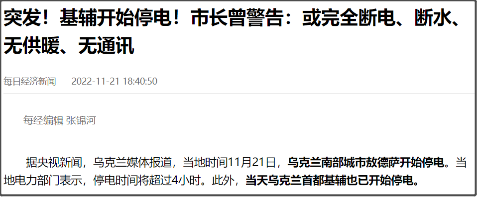 最近基辅和敖德萨这些乌克兰大城市,已经开始出现频繁停电,这个一方面是乌克兰已经入冬,基辅也下雪了,开始有供暖压力。