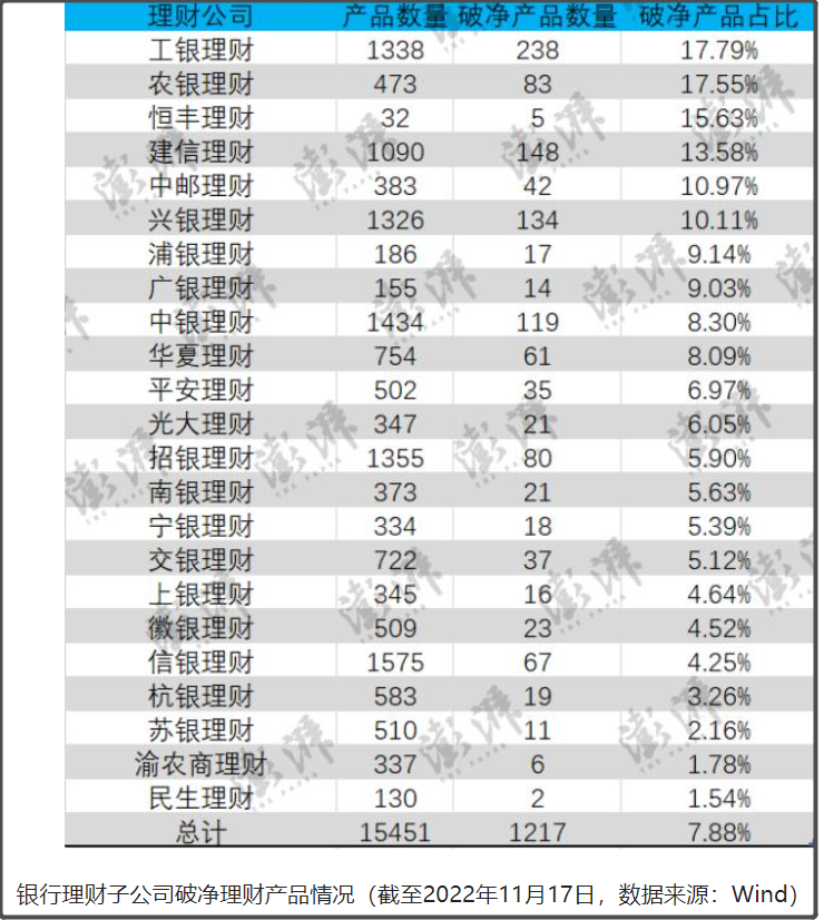 据报道,截至2022年11月17日,23家银行理财子公司共发行15451只理财产品,其中破净的理财产品数为1217只,破净理财产品占比7.88%。