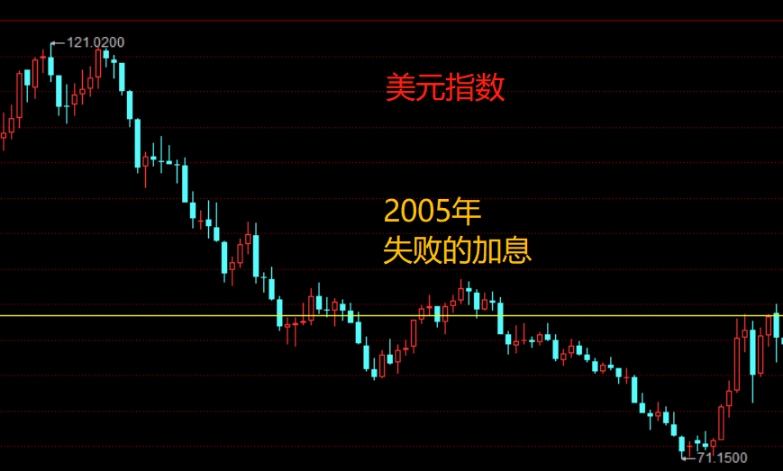 于是美国2005年的加息就失败了,美元短暂上涨后,就快速下跌