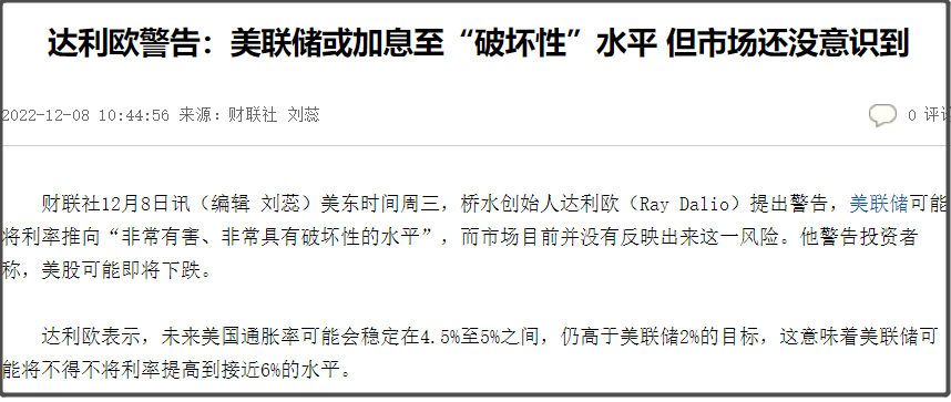 桥水基金创始人达里奥今天也跑出来警告称,美联储可能将利率推向“非常有害、非常具有破坏性的水平”。