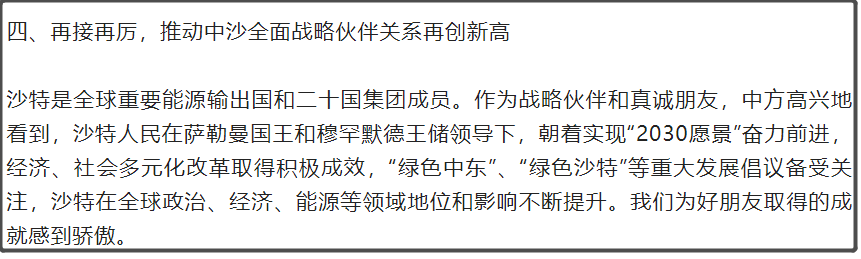 此外提到,“同沙特加强全面战略伙伴关系”。