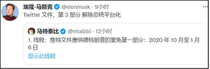 显然,这些推特内部文件资料,是马斯克“透露”给泰比,由泰比去爆料,马斯克再去转发泰比的推文。