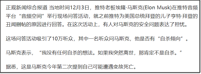 所以,看到这里,你应该就能明白,为啥马斯克要发“不自杀”声明了吧。