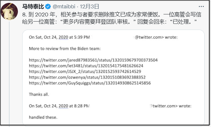 第一部分是12月3日爆出来的,内容是关于,在2020年大选之前,推特如何听从民主党的指使,去删除各种对拜登不利的言论,包括拜登小儿子的笔记本丑闻。