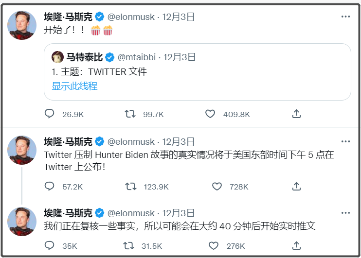 12月3日,马斯克在推特上以文字直播的方式,揭露了“推特为拜登儿子亨特删帖”传闻的内部消息。