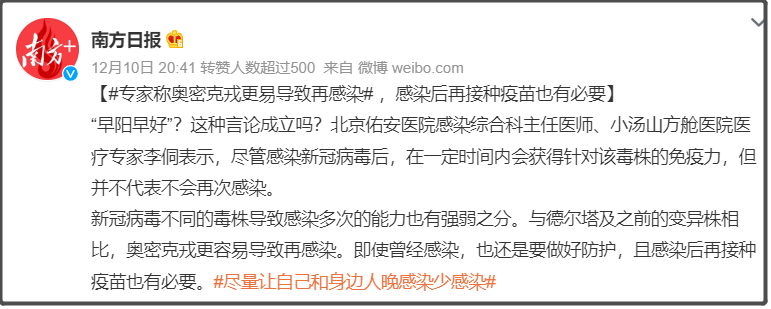 虽然这位专家末尾补充了句“当然,这不是鼓励大家去感染奥密克戎。”