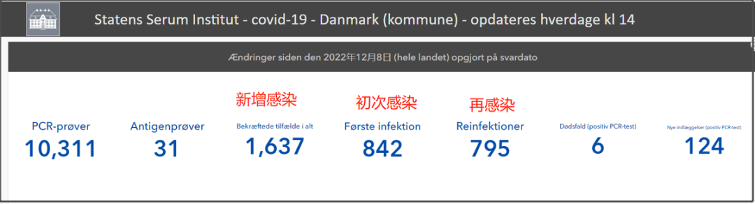 上图显示,丹麦12月8日新增1637例感染,其中初次感染842例,再感染795例。