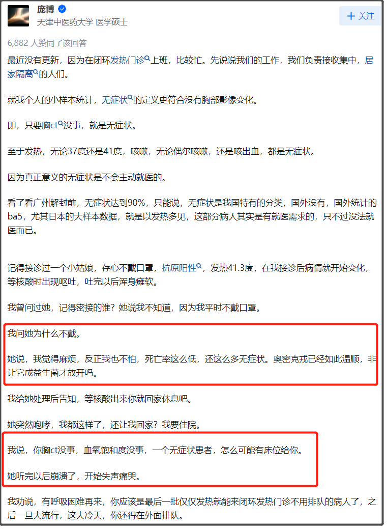 而且这个现象背后的问题,我认为是当前普遍存在的,就是人们因为轻视奥密克戎,导致遇到“轻症”,没办法理性去辨别和认知,更容易恐慌。