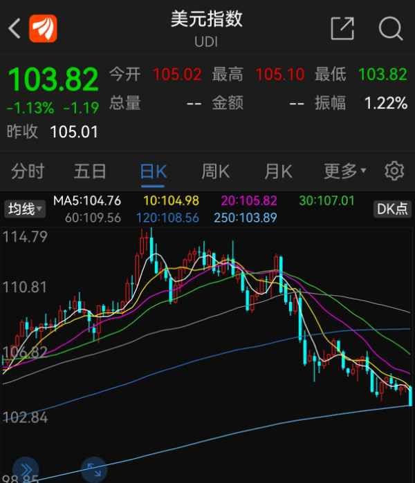 美元指数也已经跌到了103这个比较关键的点位。