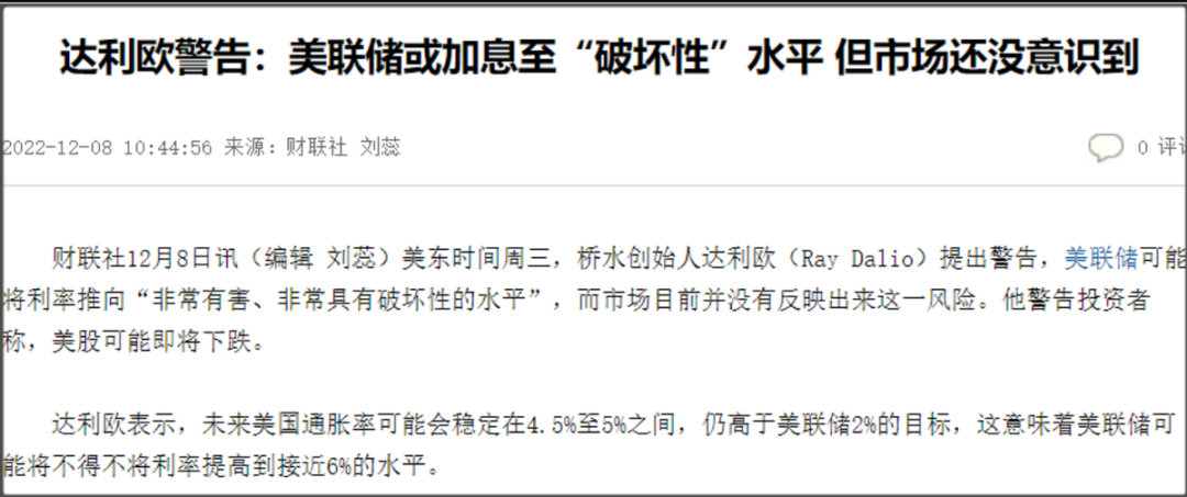 包括桥水基金创始人达里奥前几天也是出来警告,未来美国通胀率会稳定在4.5%至5%之间,仍高于美联储2%的目标,这意味着美联储可能不得不将利率提高到接近6%的水平。