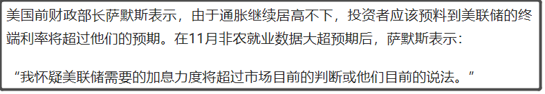 比如,美国前财长萨摩斯表示:“我怀疑美联储需要的加息力度将超过市场目前的判断或他们目前的说法。”