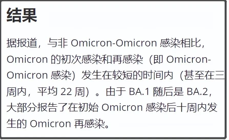 “其中提到,Omicron 的初次感染和再感染(即 Omicron-Omicron 感染)发生在较短的时间内(甚至在三周内,平均 22 周)。”