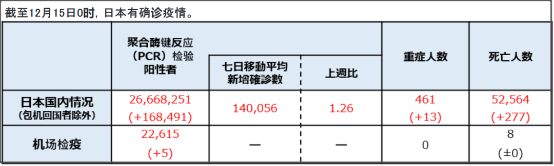 日本12月15日最新的数据显示,日本新增16.8万人感染,新增277人死亡。