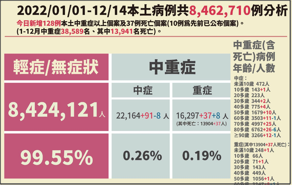 根据台湾省的数据,今年台湾省一共有846万新增病例,其中99.55%是轻症和无症状,但中症率加起来也有0.26%,重症率有0.19%,死亡率有0.16%。