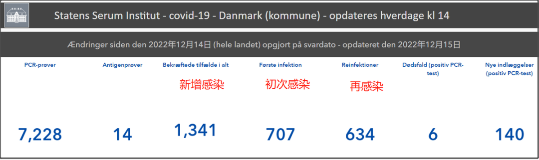 比如,上次我跟大家贴过的丹麦官方疫情统计数据,12月15日最新的数据显示,丹麦新增1341例感染,其中初次感染707例,再感染634例。