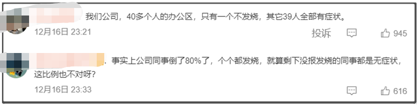 也有人说,“公司同事感染了80%,个个都发烧,就算剩下没报发烧的同事都是无症状,这个比例也不对。”