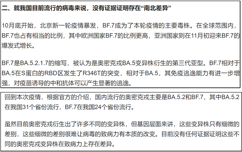 至于所谓南北毒株差异,也有病毒学家科普了,BF.7和BA.5.2的毒性并没有太大差异。