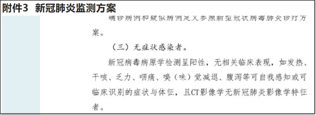 第九版防控方案里的附件3,有明确规定,无症状感染者是指:新冠病毒病原学检测呈阳性,无相关临床表现,如发热、干咳、乏力、咽痛、嗅(味)觉减退、腹泻等可自我感知或可临床识别的症状与体征,且CT影像学无新冠肺炎影像学特征者。