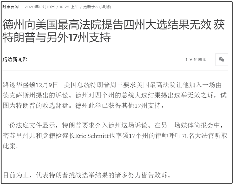 昨天提到过,12月8日是美国法律规定关于大选所有诉讼争端的截止日,不过这是针对地方法院的。