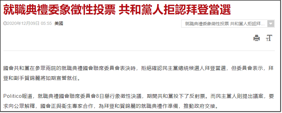 所以这个委员会昨天虽然拒绝承认拜登当选,但也只是说他们要等到12月14日选举人团投票后,才会承认拜登当选。并且同时表示,拜登将如期宣誓就任。