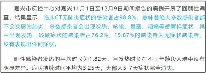 根据嘉兴官方发布的报道,嘉兴市疾控中心对嘉兴11月1日至12月9日期间报告的病例开展了回顾性调查,结果显示:多数感染者会出现发热、咳嗽、鼻塞、咽痛等感冒样症状,其中出现发热、咳嗽症状的感染者占76.2%;
